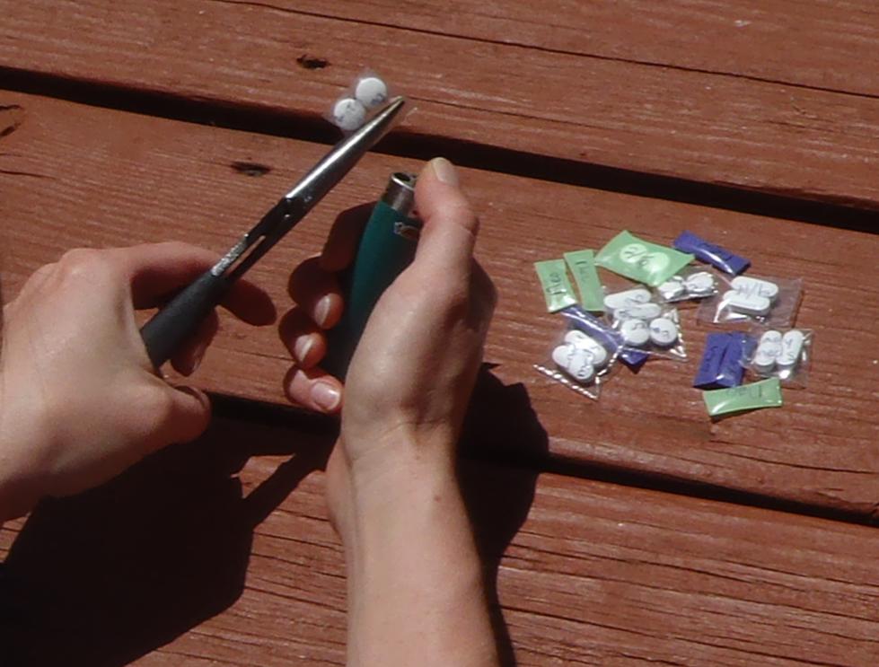 Create pill pockets by singeing the edges of a plastic bag – be sure to label with medication name, dosage, and expiration – all in a well ventilated area.