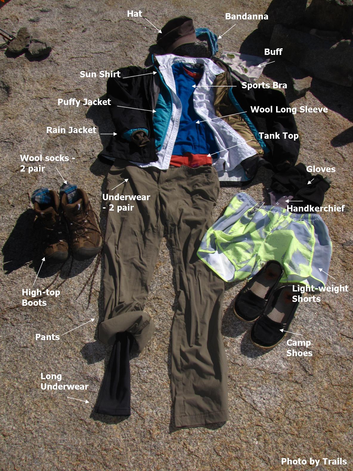 When getting ready for any type of trip I have a method for insuring I don’t forget any clothing; I work from top to bottom – visualizing what needs to go on my head all the way down to what goes on my feet. For backpacking all fabrics are either synthetic or wool – NO COTTON. Cotton does not dry quickly nor wick away sweat.