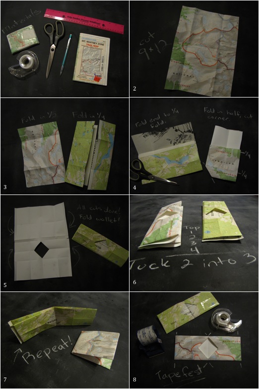 There are many benefits to a map wallet: light weight, cheap, cashiers give you lots of complements, and if you get lost when in the area that your map covers you’re set! To start, keep an eye out at your local outdoorsy store for maps on clearance. While you can use any type of paper really, my favorite is the waterproof and tearproof maps.