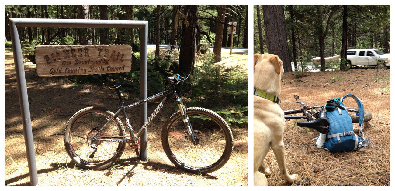 I heard about Pioneer Trail in Sactown Magazine and Moon’s Northern California Biking. The trail grows progressively harder with clear turn-around points. I’m a newbie so I wasn’t passing White Cloud Campground, which worked well since I didn’t have to worry about crossing Highway 20 with Aspen. Instead, I just had to worry about the trail paralleling Highway 20, sometimes two feet away, the whole ride. TWO FEET! I’m not exaggerating and I feel like after reading two trail descriptions, this should have been mentioned for those of us with adventure pups. They both mentioned that the trail “runs along” or is “often in sight of” the highway, but I thought that just meant it was visible throughout the ride. No sir. Sometimes you’re a nice distance from it, but a good stretch is never farther than 15 feet. If you’re biking with a dog that doesn’t heed your every call, this is not the trail for you.